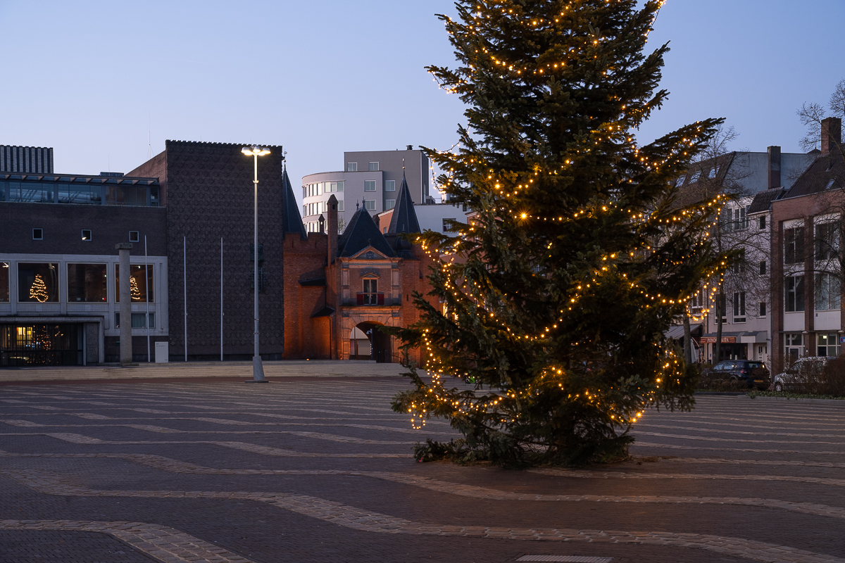 Foto 7 Ik had scherp gesteld op de Sabelpoort in de achtergrond. Toen ik thuis deze foto, groot op mijn 27” beeldscherm zag was ik lichtelijk verbaasd, door de mooie sterretjes in de lichtjes van de kerstboom. 1/5 sec. bij f/11, ISO 400 op 55.5 mm. (Sigma 20-200mm. F3.5-6.5 DG | Contemporary)